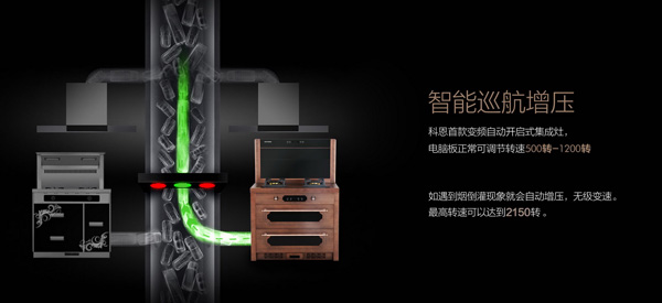3、科恩首款變頻自動開啟式集成灶還有一個強大的智能化效果——消除CO殘留:當廚房環境超PM2.5限定值時自動把油煙抽吸凈化,當低于PM2.5標準值時復位停止。