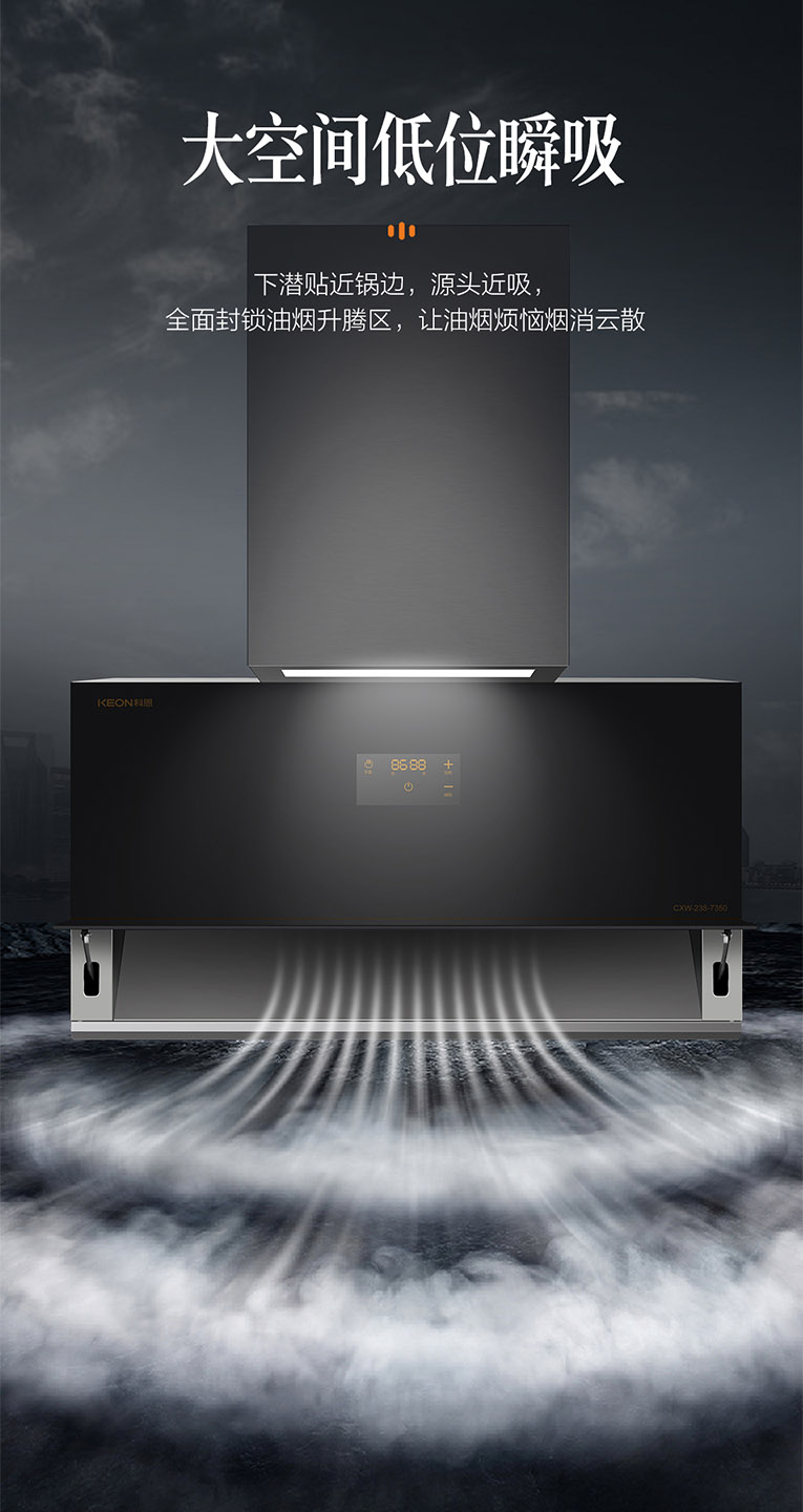 告別油膩,遠離油煙,享受健康廚房!集成灶十大品牌、廚電行業十大品牌科恩新一代大吸力煙機7350滿足多種烹飪需求,讓廚房不再有油煙!