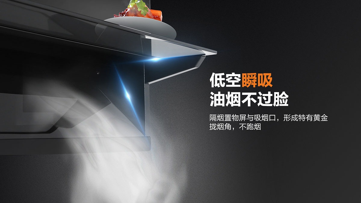 - 獨特黃金吸煙角,二次冷凝板內傾設計,油煙不過臉
