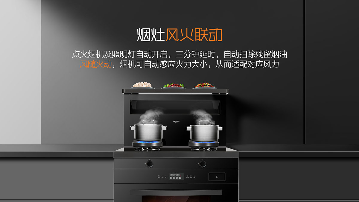 - 煙灶聯(lián)動,點(diǎn)火自動同步開啟油煙機(jī)