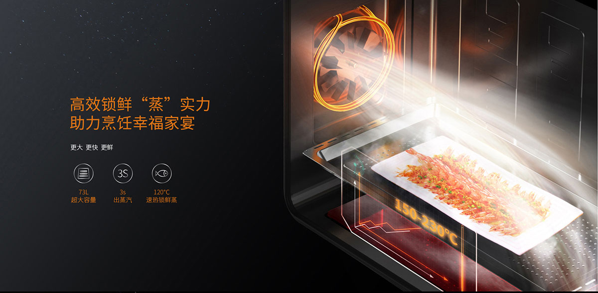 • 73L大容量、8大模式、4大輔助功能,蒸烤炸燉四位一體