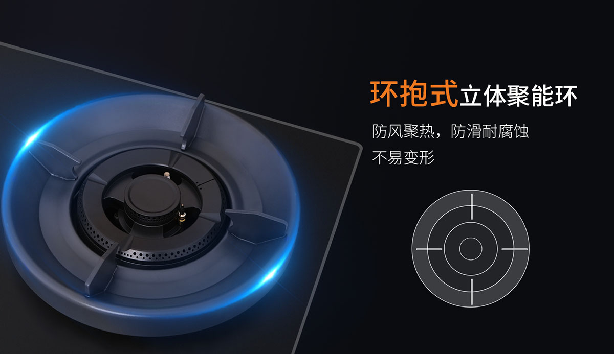 • 環抱式立體聚能環,防風聚熱,提升熱效
